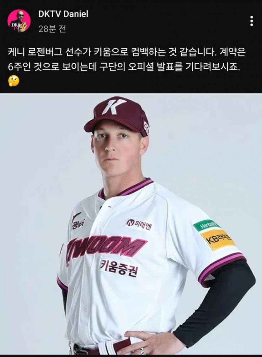 6주 대체선발로로젠버그 다시 영입 ㄷㄷ