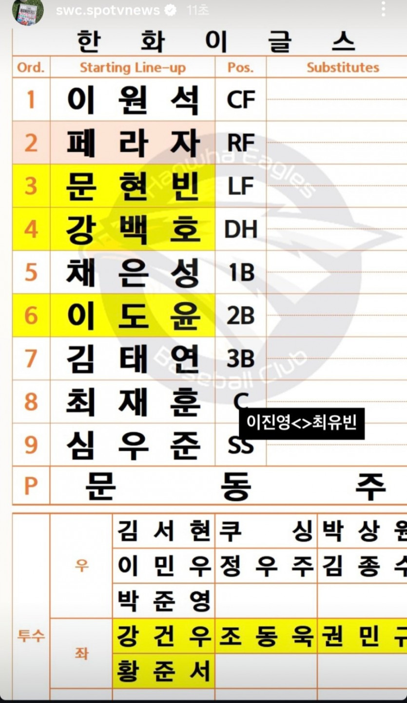 한화 확정 라인업