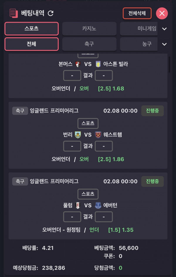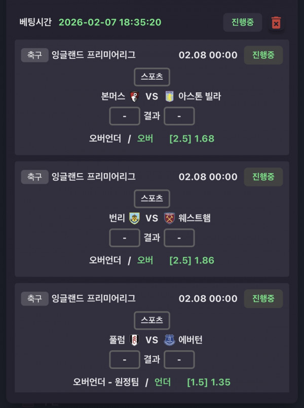 본머스 2.5옵 번리 2.5옵 풀럼 원정팀 1.5언더