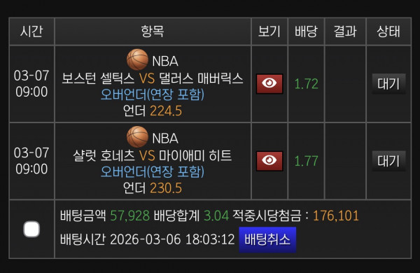 보스턴 224.5언더 샬럿 230.5 언더